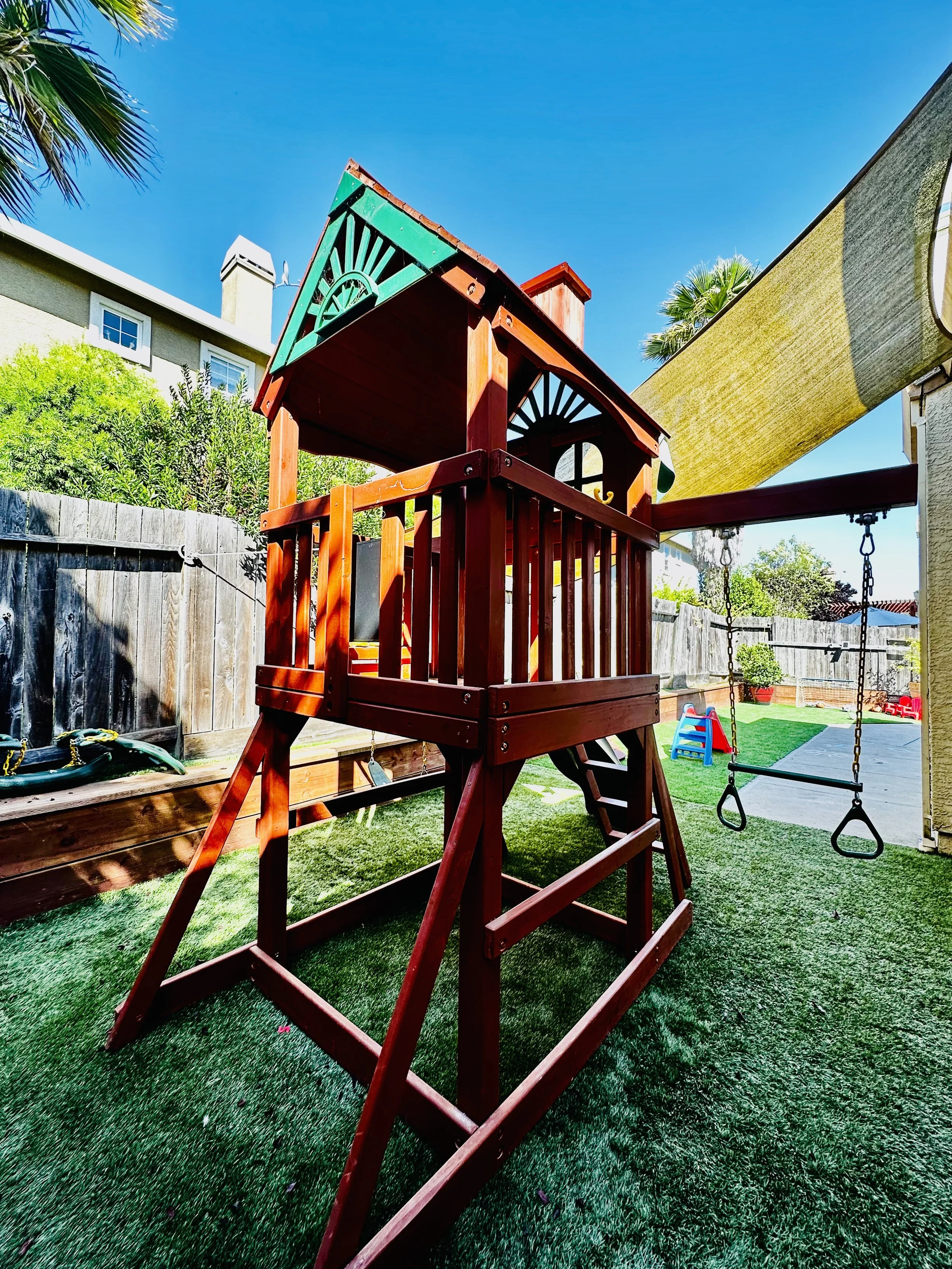 Our newly renovated playground includes ride-on-toys, a large sail shade, soft turf grass, a 2-level wooden playset with toddler swings, slides, and a rock-climbing wall. A large gazebo provides shade over the picnic benches and sensory tables.